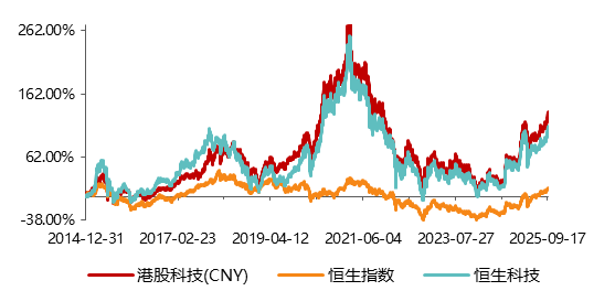 全市场唯一覆盖“中国十大科技股”的港股科技类指数港股科技指数(931674)相对恒生科技指数表现更优。据Wind数据显示,港股科技指数(CNY)自基日2014年12月31日至2025年9月17日,累计涨幅133.57%,同期恒生科技指数涨幅111.14%。