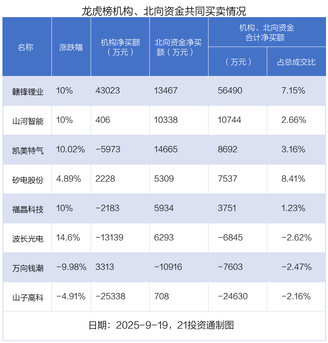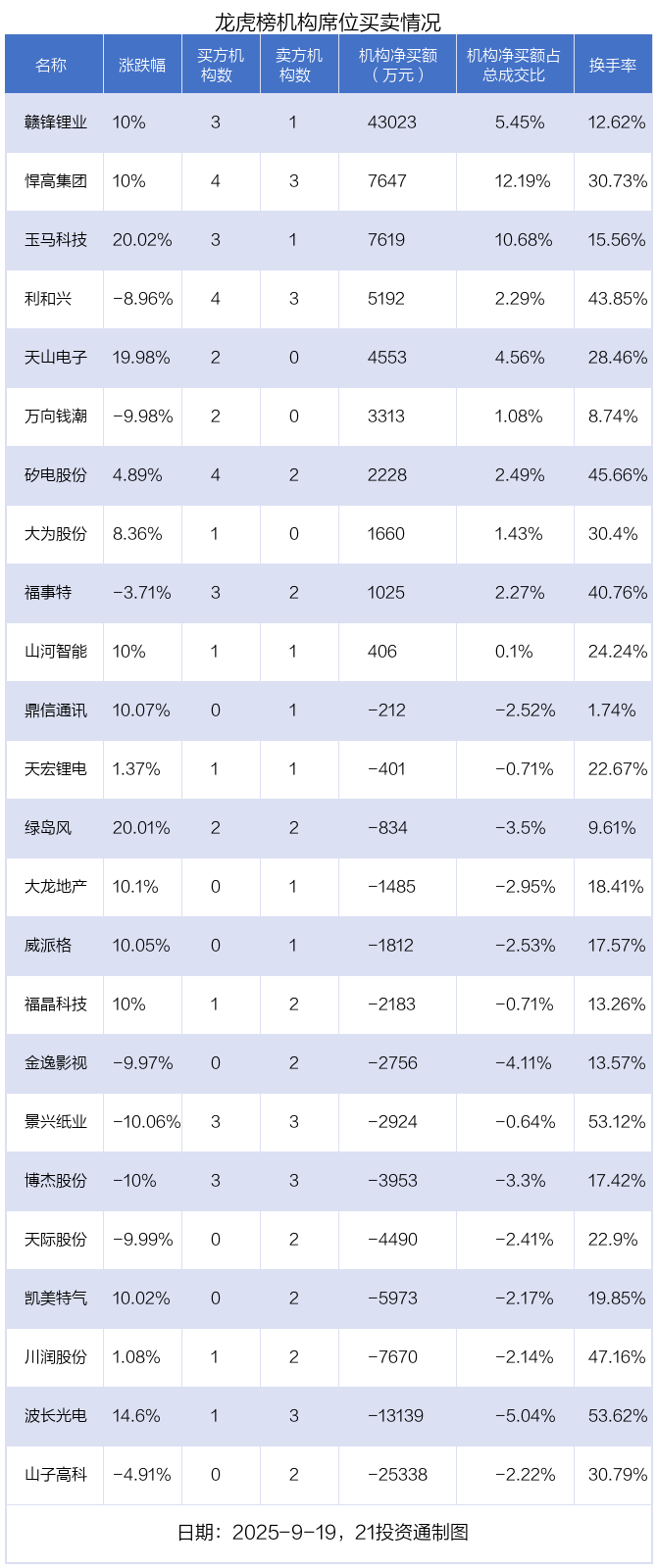 摘要:9月19日,上证指数下跌0.3%,深证成指下跌0.04%,创业板指下跌0.16%。盘后龙虎榜数据显示,共有49只个股因当日异动登上龙虎榜,资金净流入最多的是赣锋