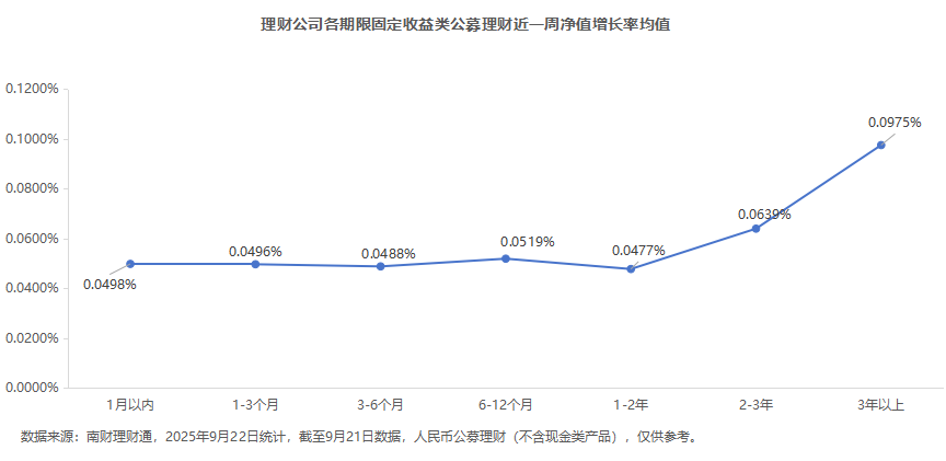 破净产品数量维持在低位。南财理财通数据显示,截至2025年9月21日,理财公司共有26,354只存续公募理财产品,其中285只累计净值低于1,银行理财综合破净率为1.08%。权益类、混合类理财破净率分别为18.37%和3.04%,固定收益类公募理财破净率为0.95%。