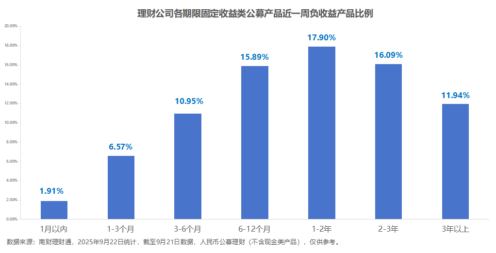 南财理财通数据显示,固定收益类理财中,1—2年期限近一周负收益产品占比最高,为17.9%。1个月以内期限负收益产品数量占比最低,为1.91%。