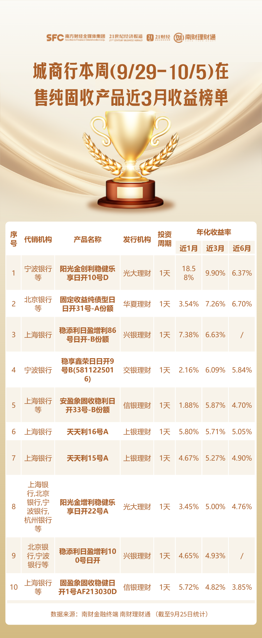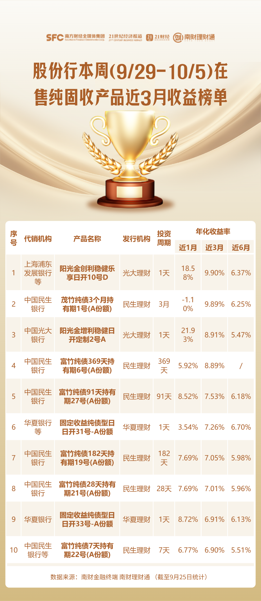 编者按:当前银行理财货架产品琳琅满目,诸如“增强”“稳健”“均衡”等名称相近、特征模糊的产品层出不穷,投资者应如何甄别与选择?为降低投资者的选择成本,南财理财通课题组从代销机构角度入手,每周一聚焦各渠道当周在售的理财产品,搜罗其中业绩表现优异者,并发布代销产品业绩榜单。