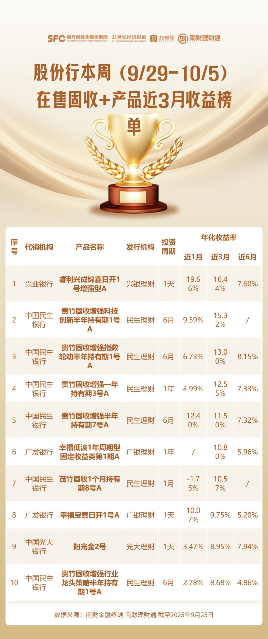 编者按:当前银行理财货架产品琳琅满目,诸如“增强”“稳健”“均衡”等名称相近、特征模糊的产品层出不穷,投资者应如何甄别与选择?为降低投资者的选择成本,南财理财通课题组从代销机构角度入手,每周聚焦各渠道当周在售的理财产品,搜罗其中业绩表现优异者,并发布代销产品业绩榜单。