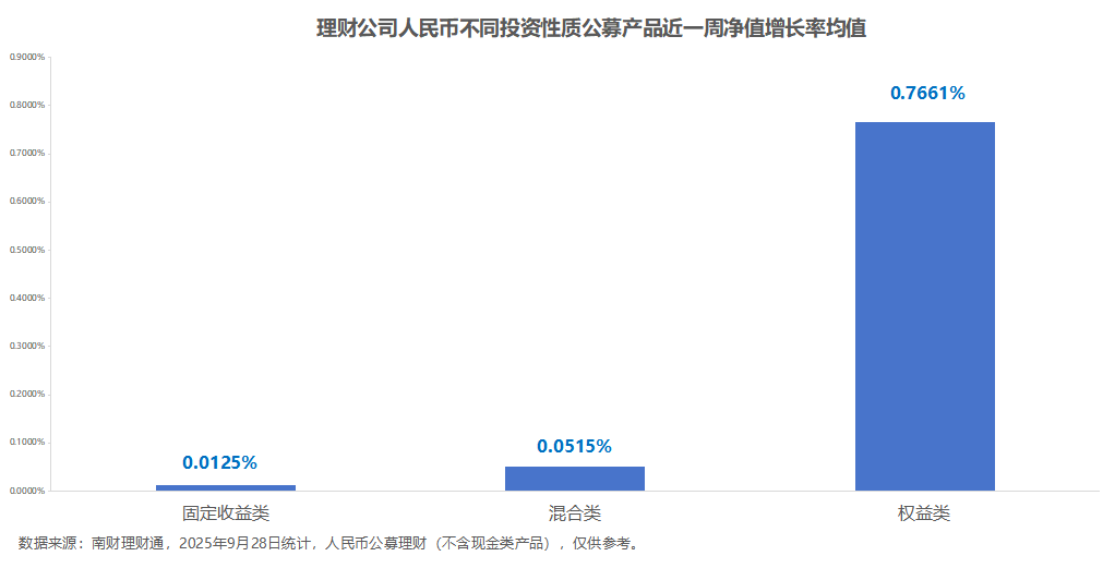 理财破净率走高。南财理财通数据显示,截至2025年9月28日,理财公司共有26,298只存续公募理财产品,其中367只累计净值低于1,银行理财综合破净率为1.4%。权益类、混合类理财破净率分别为20.41%和2.82%,固定收益类公募理财破净率为1.29%。