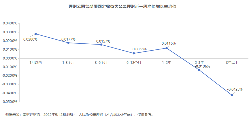 周度收益情况:因债市表现不佳,固定收益类理财收益下降。固定收益类理财近一周平均净值增长率为0.0125%,混合类、权益类近一周平均净值增长率分别为0.0515%、0.7661%。固定收益类产品中,1个月以内期限产品近一周净值增长率均值最高,为0.028%。3年以上期限产品周收益率最低,近一周净值增长率均值为-0.0425%。