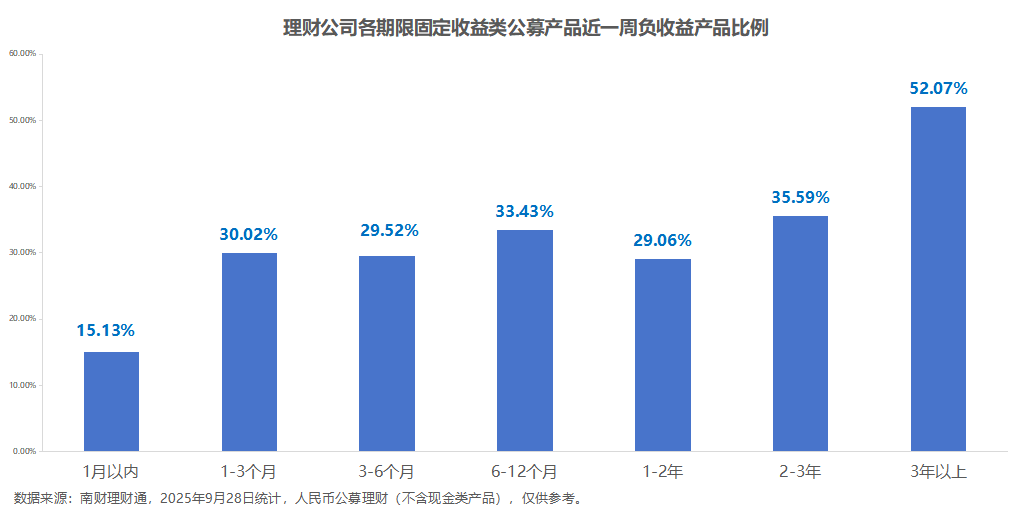 南财理财通数据显示,固定收益类理财中,3年以上期限近一周负收益产品占比最高,为52.07%。1个月以内期限负收益产品数量占比最低,为15.13%。