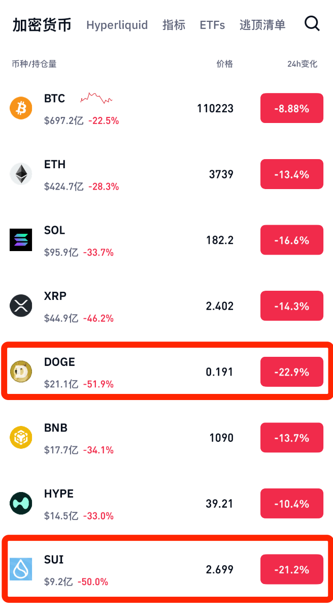 狗狗币、SUI 等小市值币种跌幅更为惨烈,持仓量腰斩。