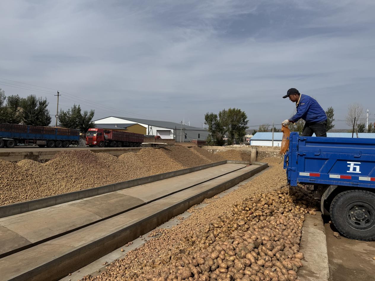华欧淀粉生产线上 农户正在倾倒新产马铃薯 记者杨希/摄