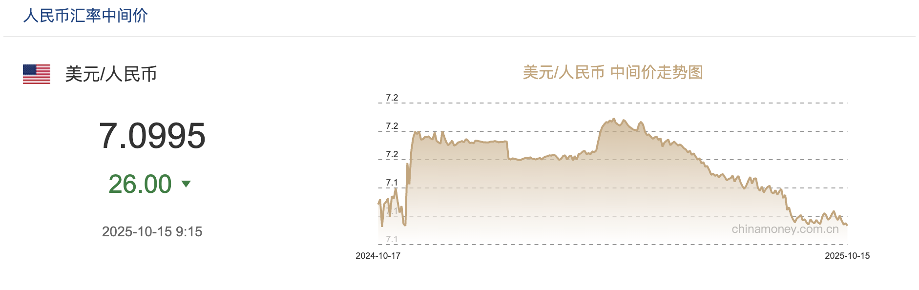 10月15日,中国人民银行授权中国外汇交易中心公布,当日银行间外汇市场人民币汇率中间价为1美元对人民币7.0995元,相较前一交易日中间价7.1021元,调升26基点。