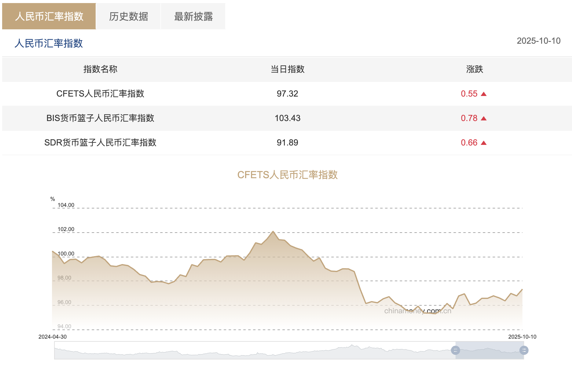 除了人民币兑美元汇率,人民币对一篮子货币近期也小幅走高。中国外汇交易中心公布数据最新显示,10月10日当周三大人民币汇率指数全线上涨,CFETS人民币汇率指数报97.32,按周涨0.55,创2025年4月以来新高;BIS货币篮子人民币汇率指数报103.43,按周涨0.78,创2025年4月以来新高;SDR货币篮子人民币汇率指数报91.89,按周涨0.66,创2025年4月以来新高。