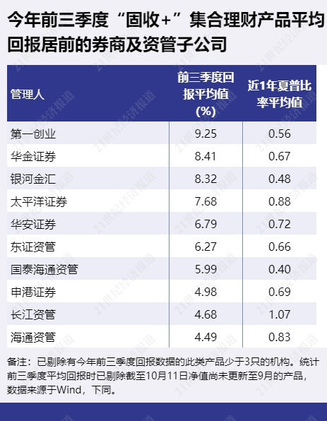 前三季度回报排前三的“固收+”集合理财产品依然为“第一创业可转债灵活配置1号”“银河稳盈20号”“银河融汇26号(RH2606)”。此类产品前三季度平均回报排名居前的券商及资管子公司有第一创业、华金证券、银河金汇等。排名靠后的券商及资管子公司包括国金资管、国证资管、中航证券等。