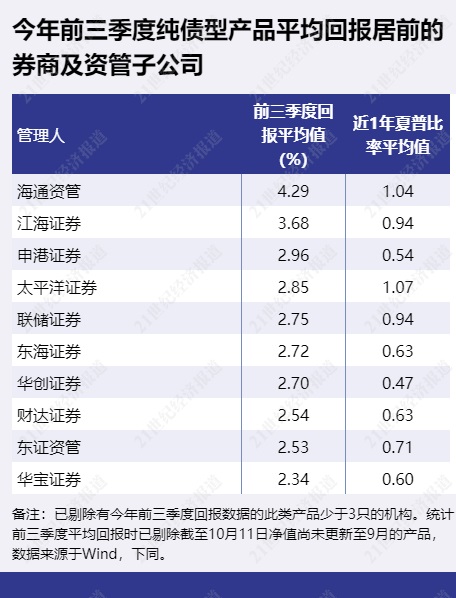 1、纯债型产品:中泰证券资管前三季度和9月平均回报排名靠后