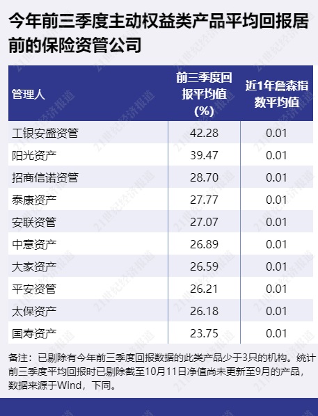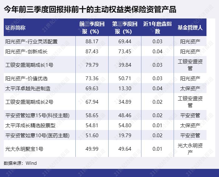 前三季度主动权益类保险资管产品收益表现亮眼,有9只产品的收益率已超50%。