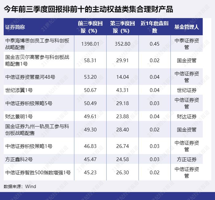 前三季度回报排前三的主动权益类集合理财产品为“中泰海博思创员工参与科创板战略配售”“国金吉贝尔高管参与科创板战略配售1号”和“中信证券资管星河48号”。此类产品前三季度平均回报排名居前的券商及资管子公司有中泰证券资管、方正证券、野村东方国际证券等。排名靠后的券商及资管子公司包括万联资管、大同证券、华龙证券等。