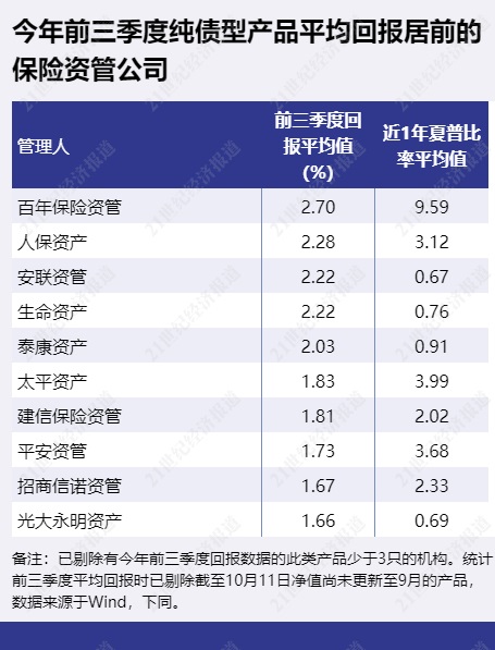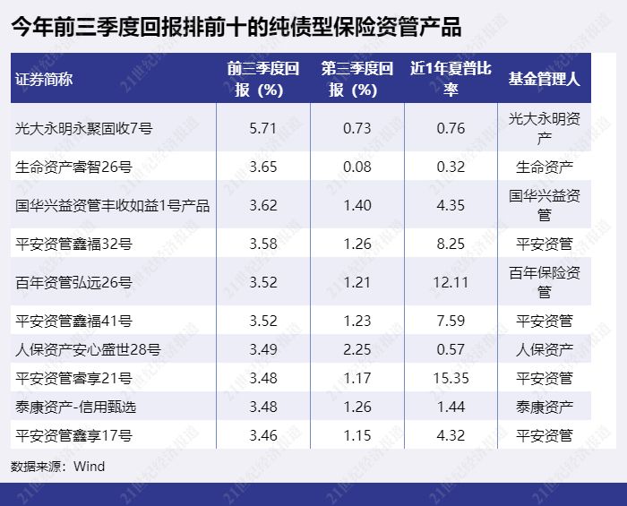 前三季度回报靠前的纯债型保险资管产品包括“光大永明永聚固收7号”“生命资产睿智26号”和“国华兴益资管丰收如益1号产品”等。此类产品前三季度平均回报排名居前的保险资管公司有百年保险资管、人保资产、安联资管等。排名靠后的保险资管公司有中意资产、工银安盛资管、国华兴益资管等。