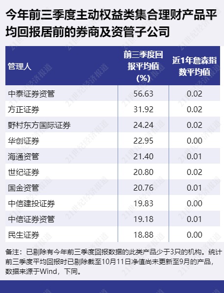 中泰证券资管主动权益类产品前三季度平均回报最高,但主要靠1只战略配售产品以1398.01%的高收益率拉高整体收益率,剔除该产品后,剩余产品前三季度平均回报仅19.37%。方正证券有4只主动权益类产品前三季度回报超过30%。