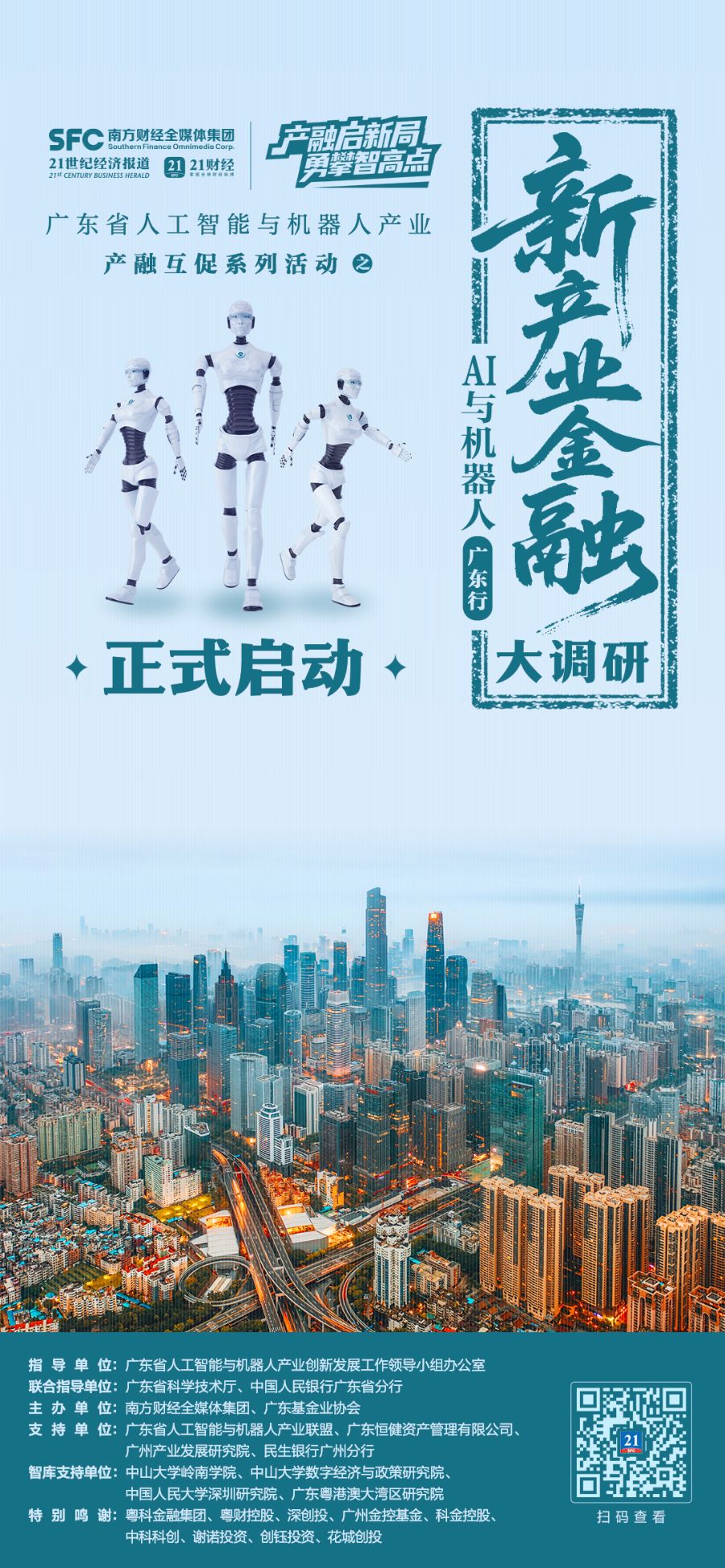 在广东省人工智能与机器人产业创新发展工作领导小组办公室、广东省科学技术厅、中国人民银行广东省分行的指导下,调研团由南方财经全媒体集团、广东基金业协会联合牵头,广东省人工智能与机器人产业联盟、广州产业发展研究院、广东恒健资产管理有限公司、民生银行广州分行等作为支持单位。