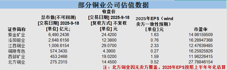 而机构覆盖力度更大的其他头部铜业公司,采用Wind卖方一致盈利预测结果与最新价计算的最新市盈率,普遍保持在17倍以下。