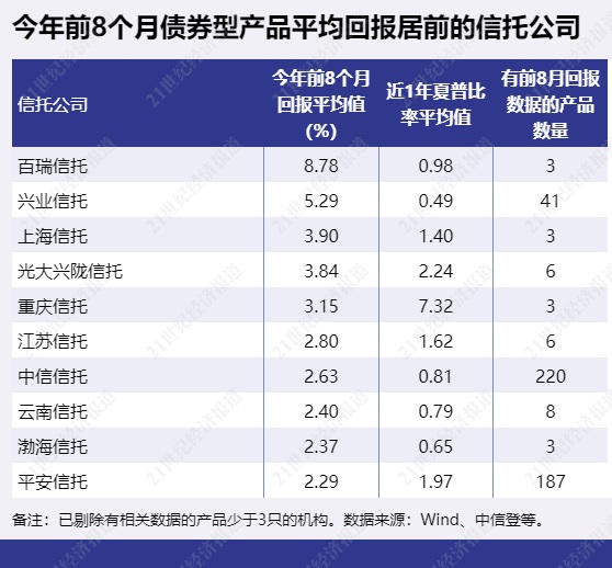 21世纪资管研究院根据Wind数据、中信登数据统计发现,机构表现方面,今年8个月债券型产品和股票型产品均表现不错的有百瑞信托、兴业信托、上海信托、中信信托、云南信托等。