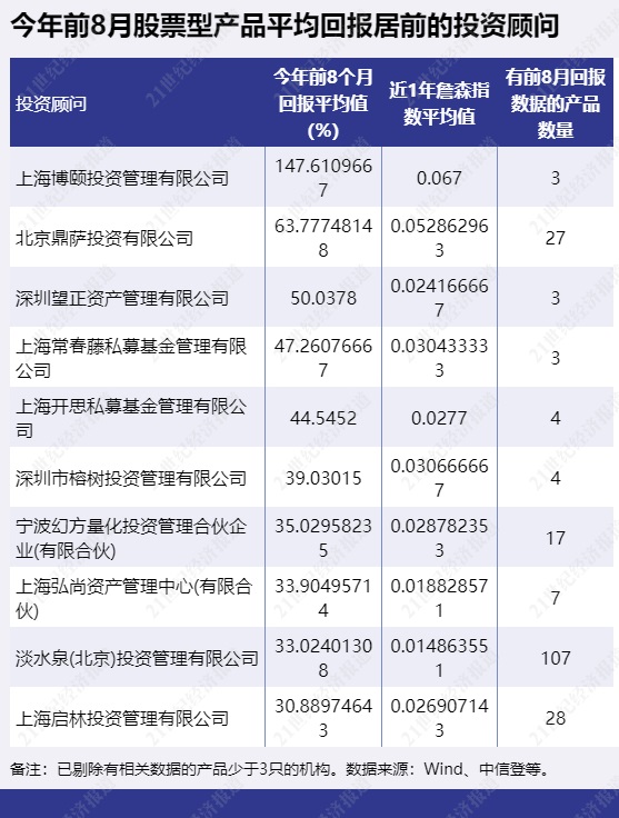 北京鼎萨投资有限公司担任投资顾问的股票型产品则前8个月表现整体较为均衡,回报均在60%以上。深圳望正资产管理有限公司担任投资顾问的产品表现也不错,前8个月回报超过45%。深圳望正资产管理有限公司和上海博颐投资管理有限公司有相关回报数据的产品数量均不多。