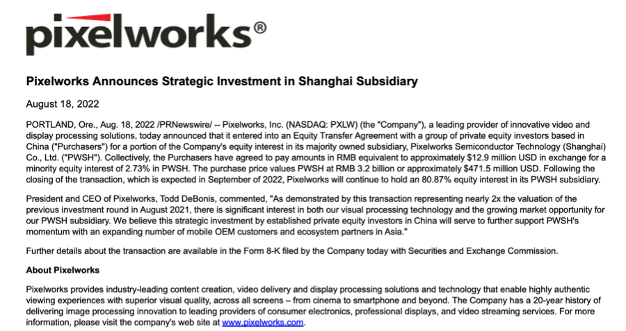 2022年8月,Pixelworks再度宣布已与一组中国私募股权投资者就PWSH的部分股权签订了股权转让协议。收购方合计同意支付约1290万美元,以换取PWSH的2.73%股权。此次收购对PWSH的估值为32亿元人民币。